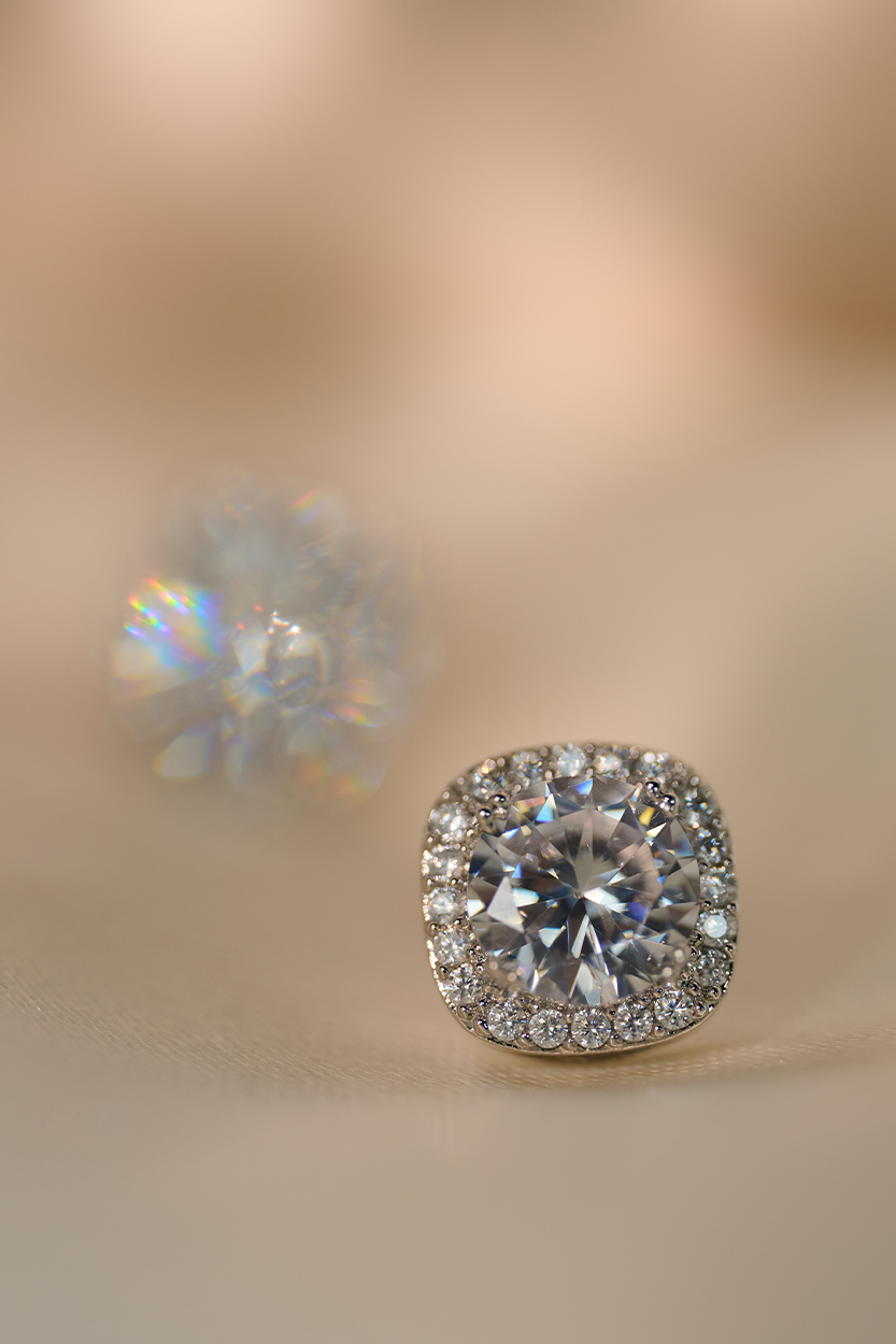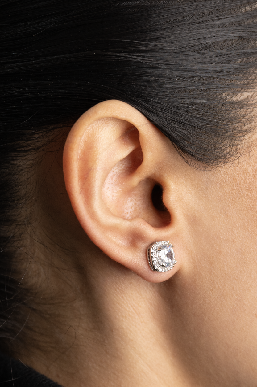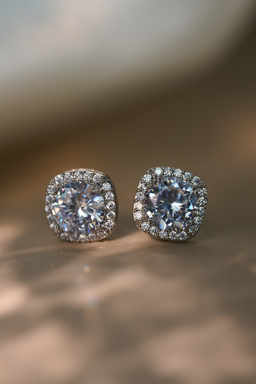 These stud earrings stand out for their elegance and shine. Featuring a luminous central stone surrounded by small gems, they create a sophisticated and timeless effect.