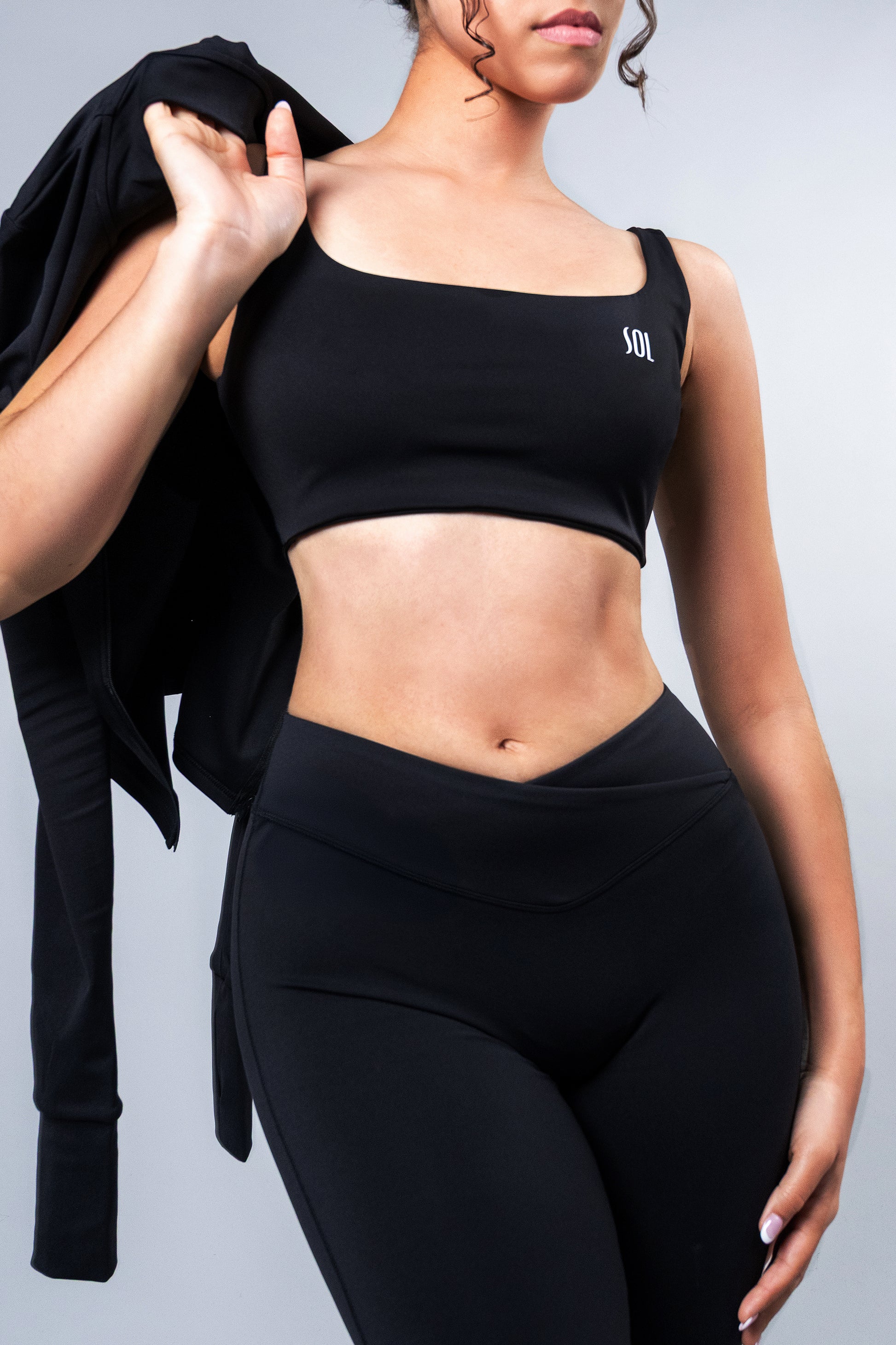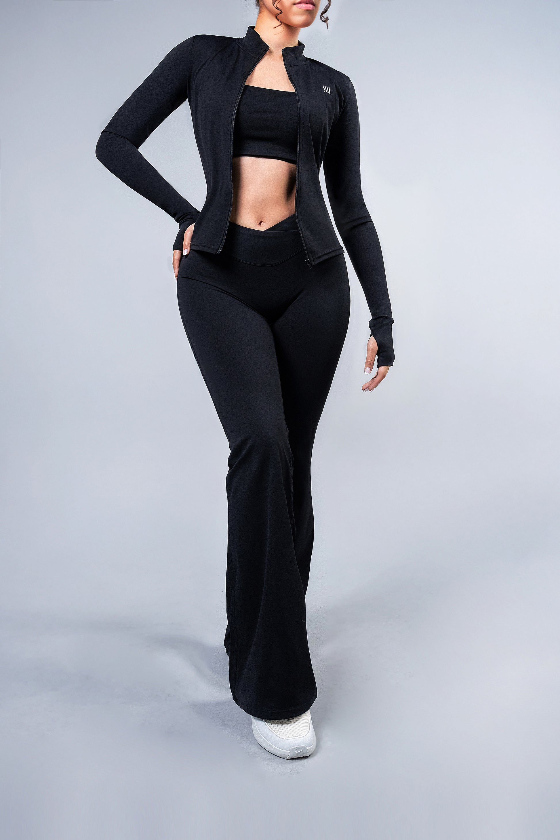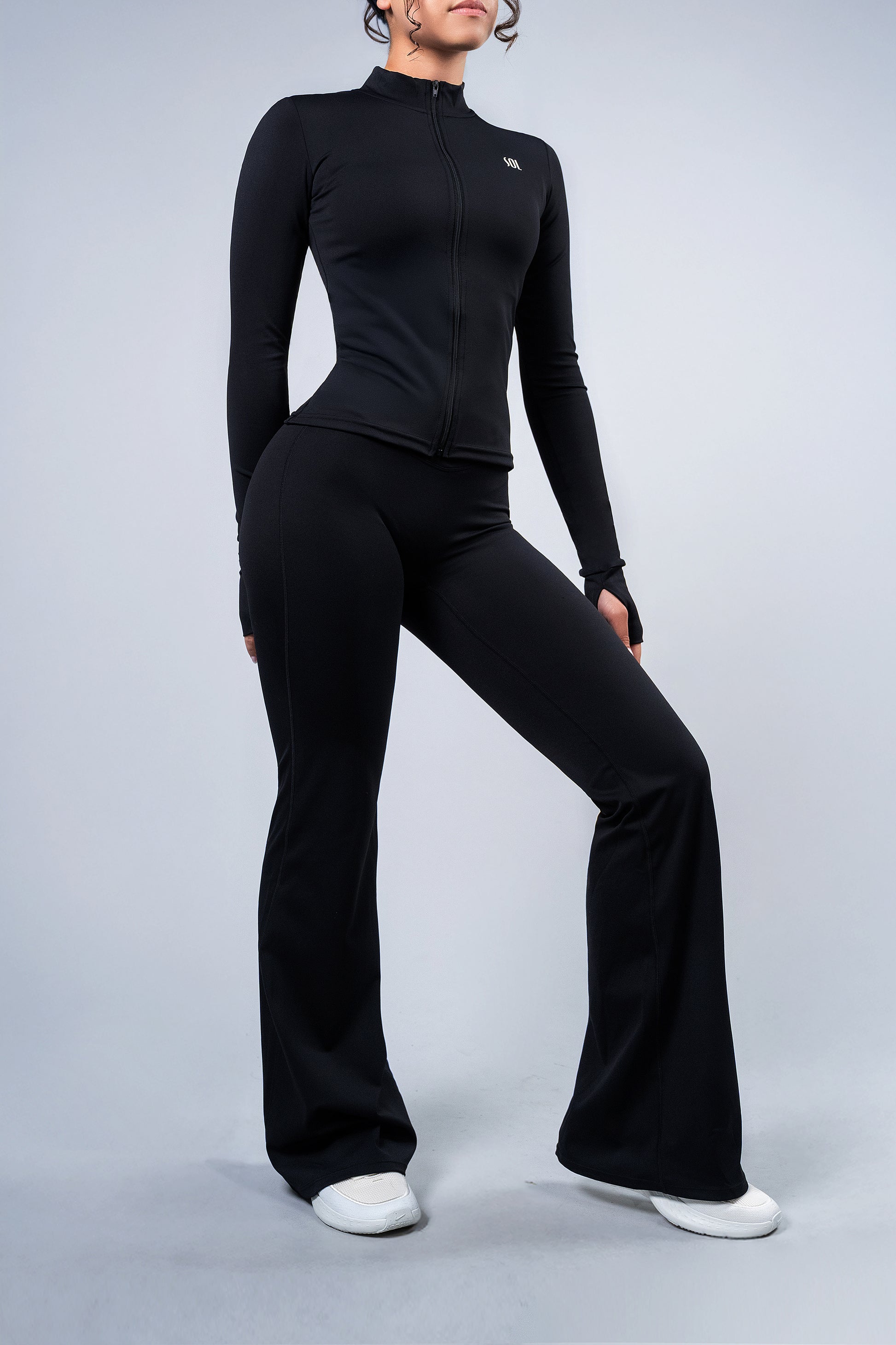 The flared leggings add a modern, stylish touch, while the top provides the ideal support for your workouts. Complete the look with the sweatshirt, perfect for staying warm without sacrificing style.